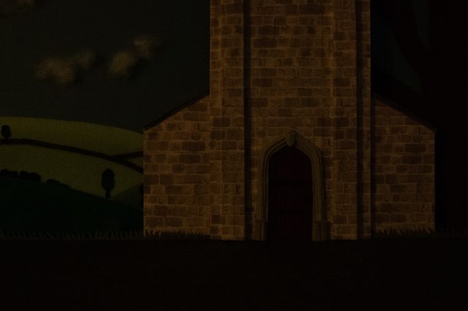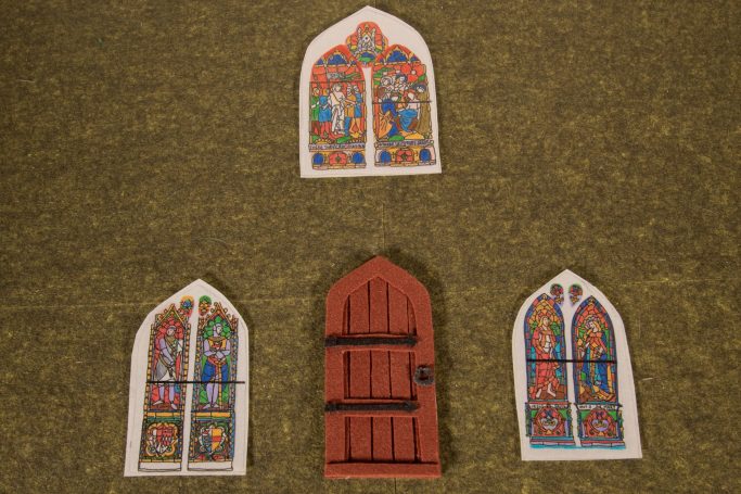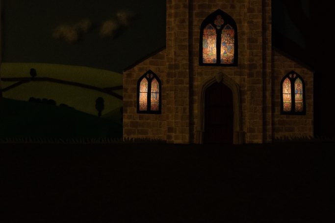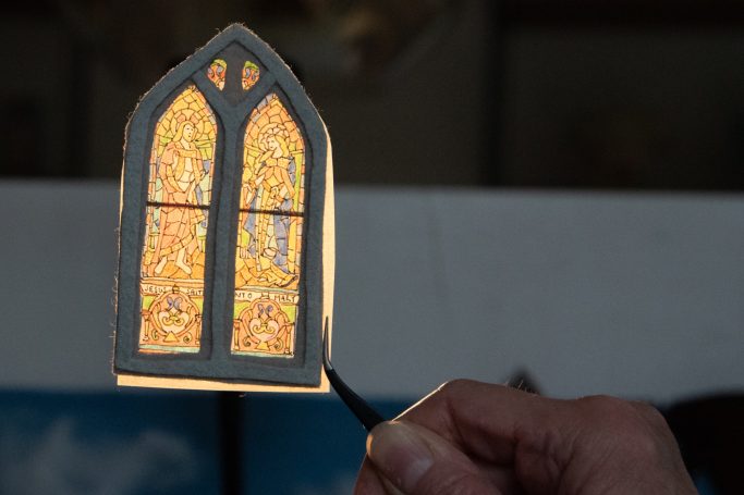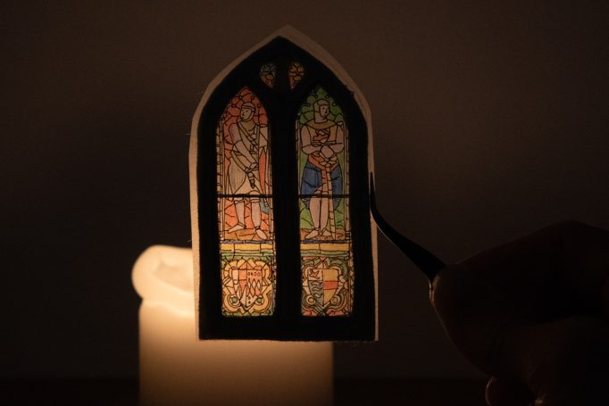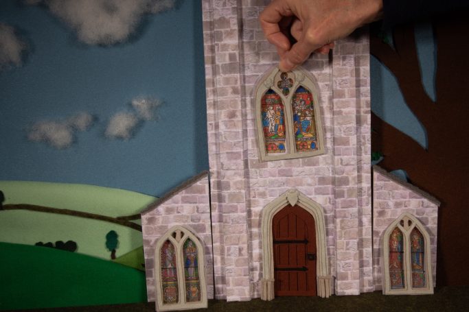 St Cuthbert's Church came to life for the Christmas carol singers. The pictures show the church tower as the starting point, with the side transepts then being added. The window and door frames were then created out of felt. The stained glass windows were drawn onto tracing paper and coloured using felt pens. The door and the windows were placed onto the church. Having confirmed everything fitted well, the stained glass needed to be back lit as the carols were going to be sung in the evening outside the church. Various light sources were tested, with candle light chosen as it offered a warm soft light. The church and back ground of the Feltbury Green hills was photographed to create the night time backdrop. The lit stained glass windows were added to provide the finishing touch. Each of the carol singers and the Reverend Jonathan were individually photographed in candlelight and then carefully positioned to create the final Christmas carol scene