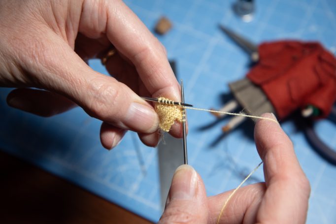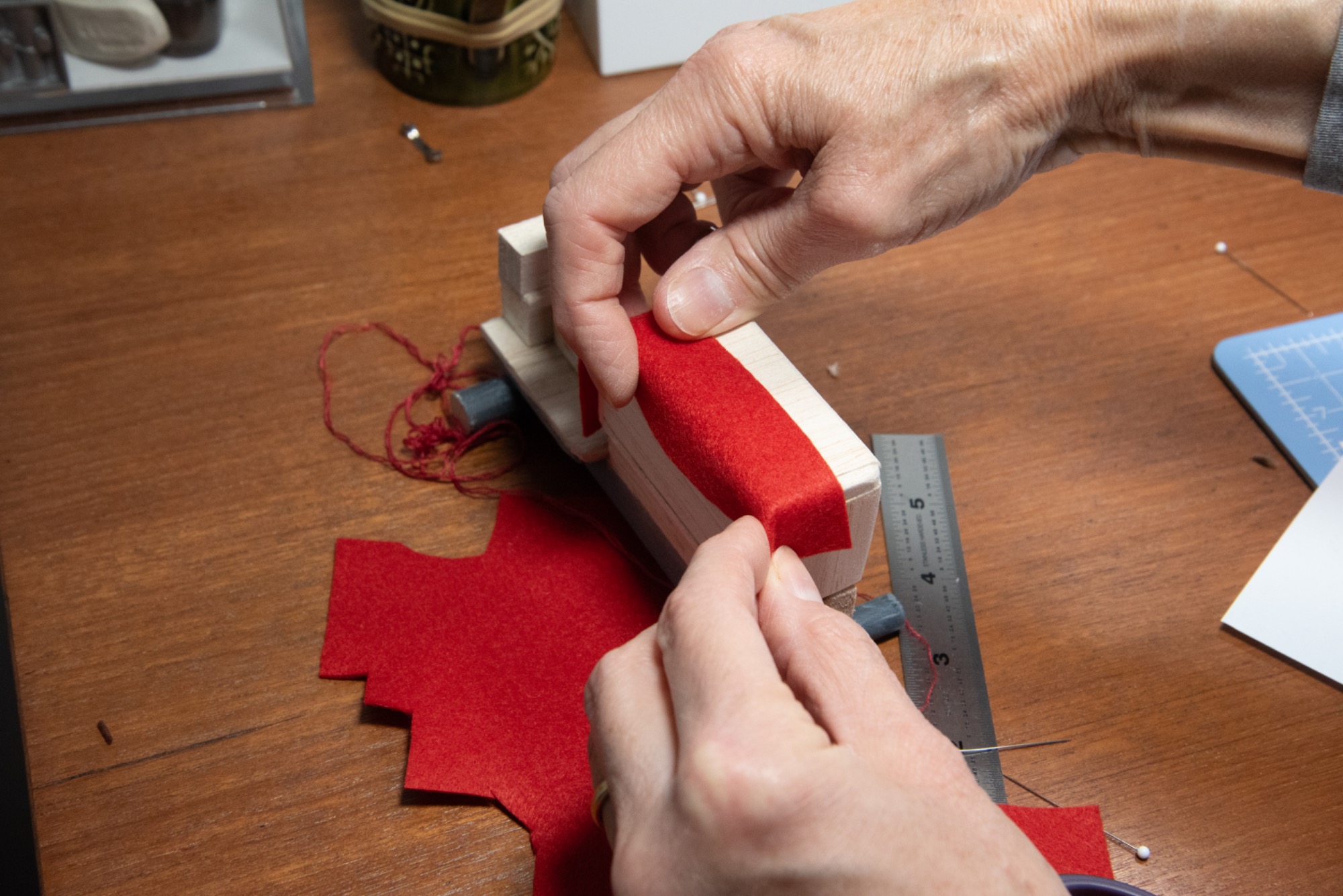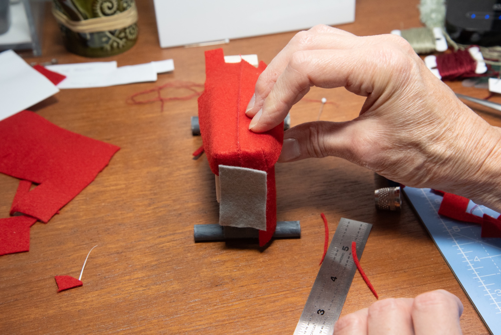 Starting with the nose first, the head is next fashioned to include the ears and eyes. The body is made using pipe cleaners and felt stuffing. This is then overlayed with the dark brown felt and hand stitched after the tail has been added. Once the body is finished, the head is put in place and secured