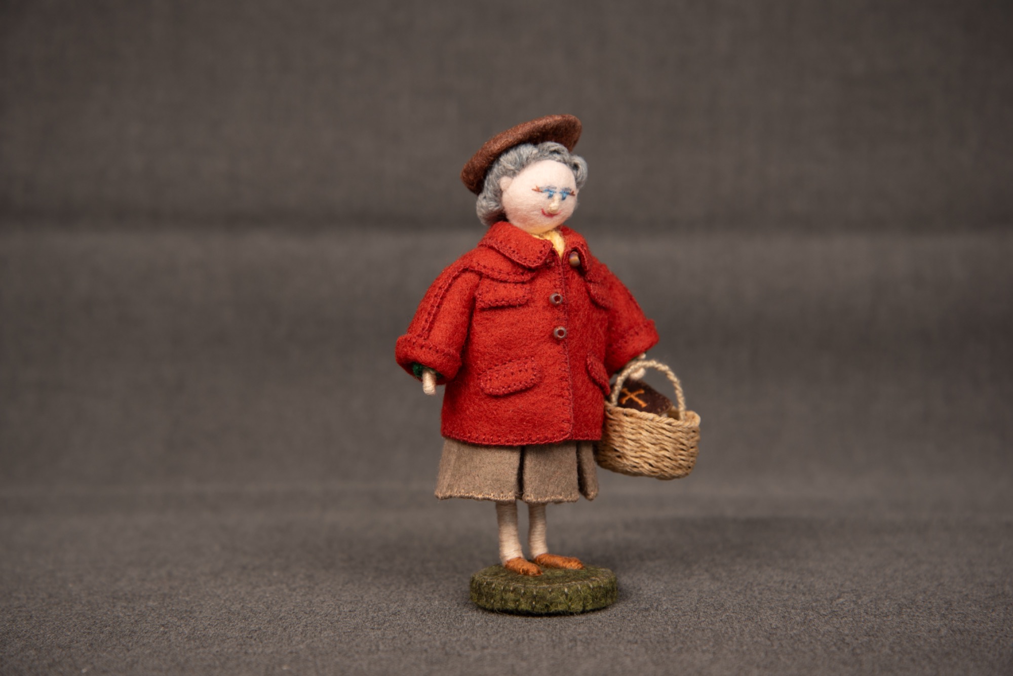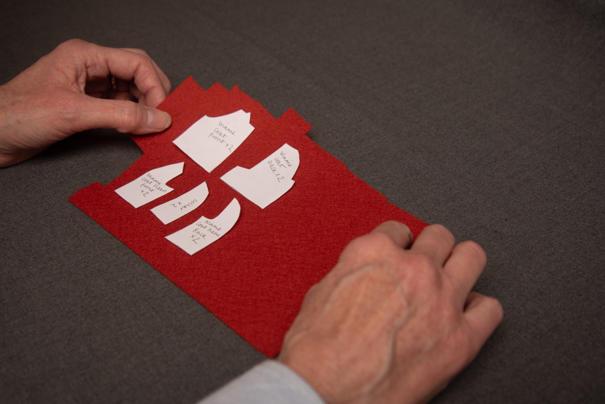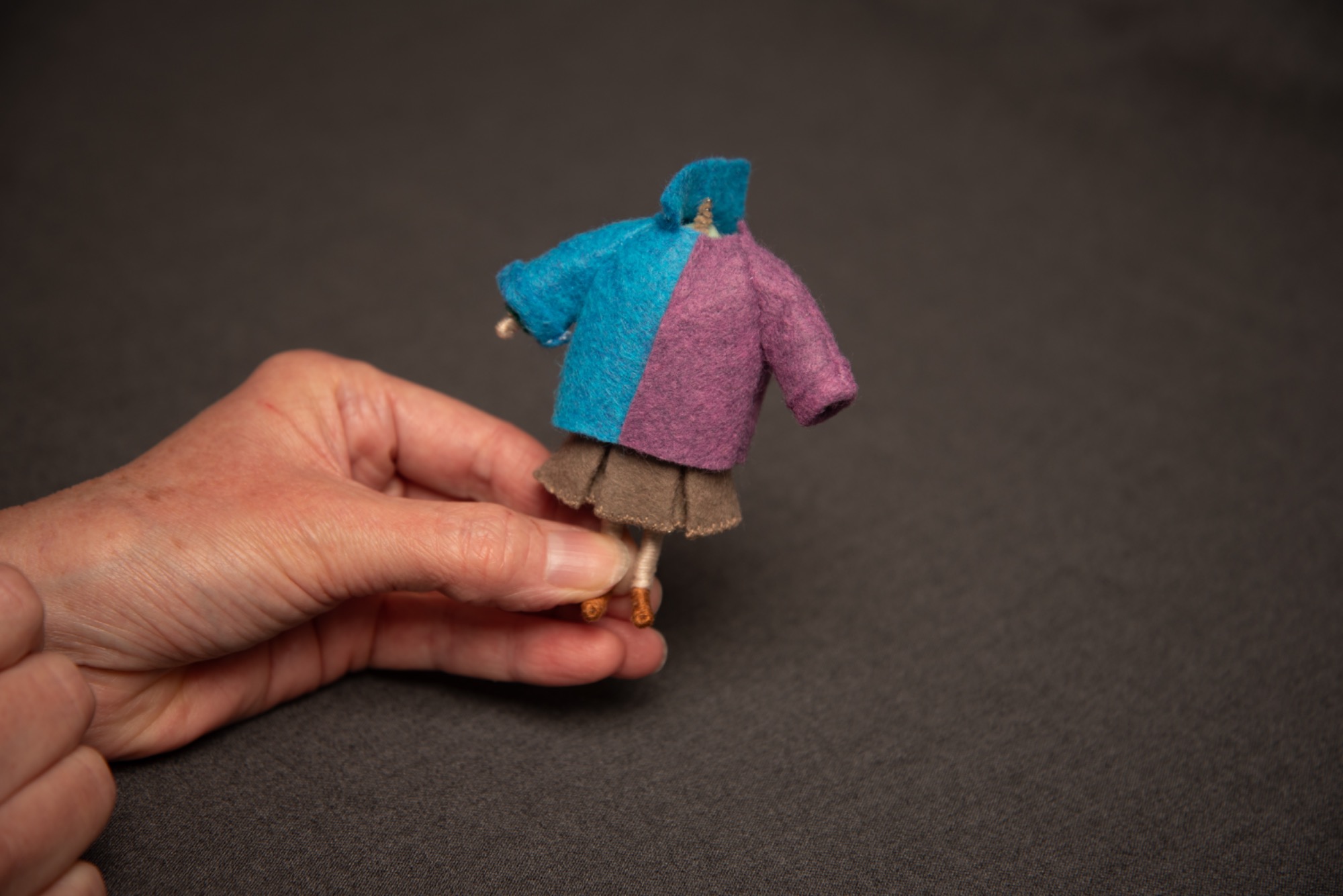 Firstly the style is chosen along with the thread and red felt colour. Then a pattern template is created. Next a toile is made from spare blue/purple felt to check the design and fit. A yellow scarf is knitted to go with the outfit. Finally the red coat is made and buttons selected to complement the style and colour. Once the final stiching touches are completed, Winnie models the finished coat. Now you can look out for Winnie and her red coat in the Feltbury Green scenes