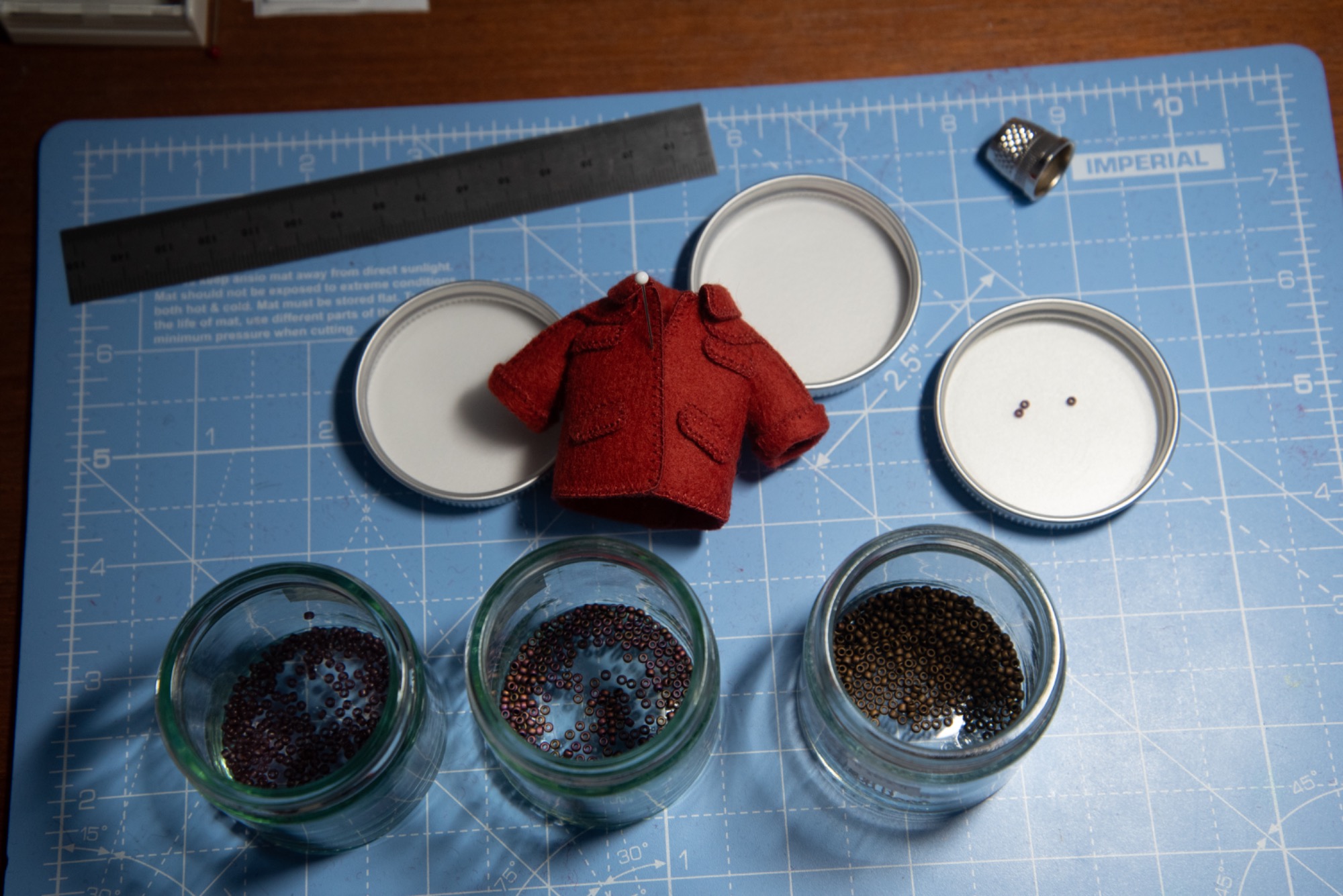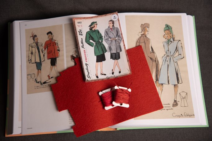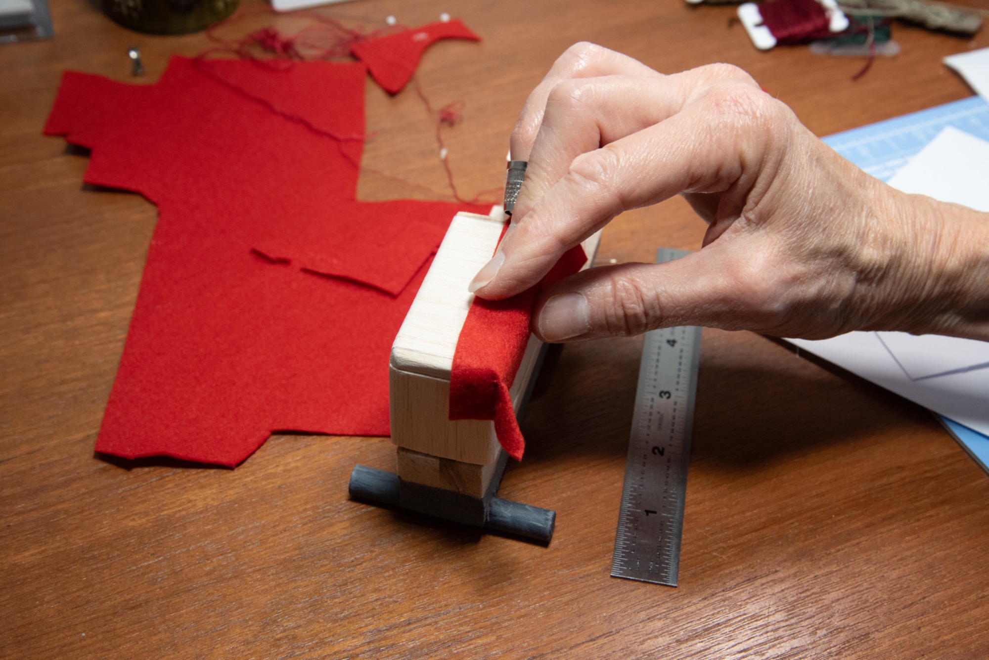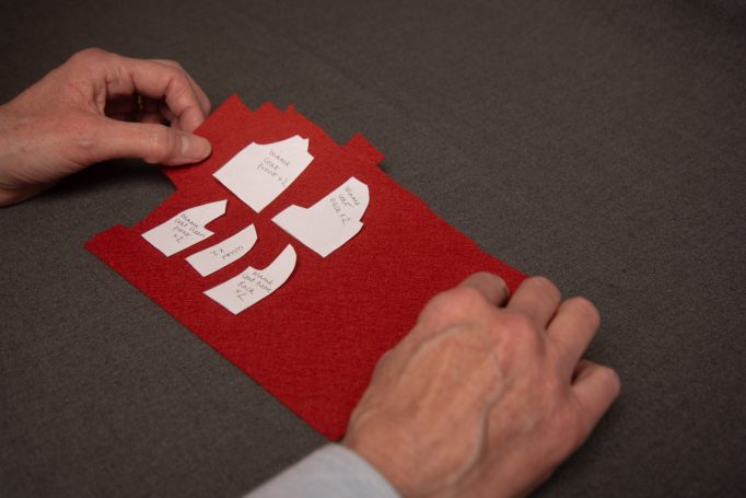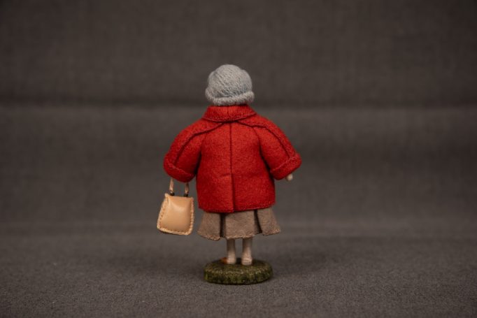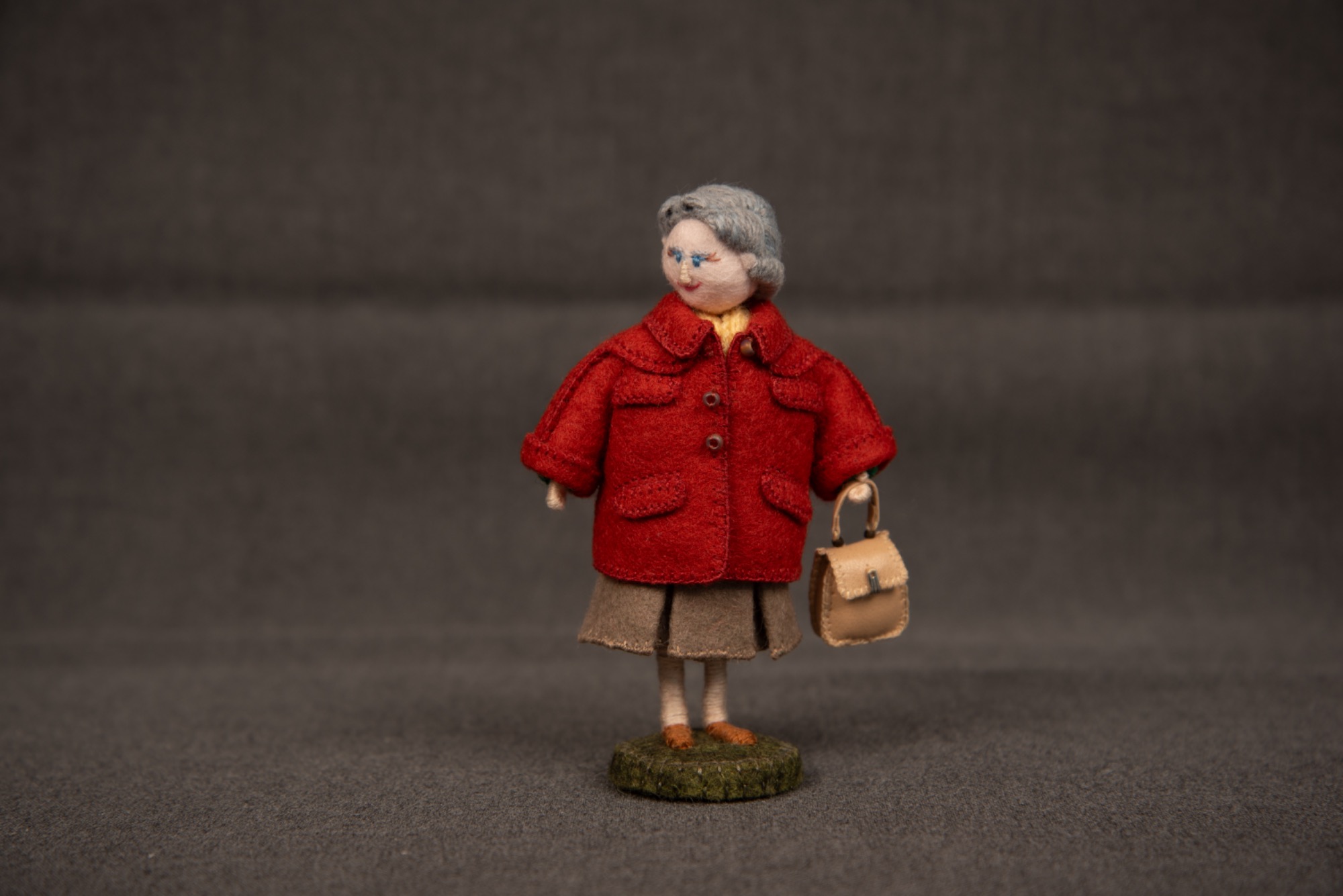 Firstly the style is chosen along with the thread and red felt colour. Then a pattern template is created. Next a toile is made from spare blue/purple felt to check the design and fit. A yellow scarf is knitted to go with the outfit. Finally the red coat is made and buttons selected to complement the style and colour. Once the final stiching touches are completed, Winnie models the finished coat. Now you can look out for Winnie and her red coat in the Feltbury Green scenes