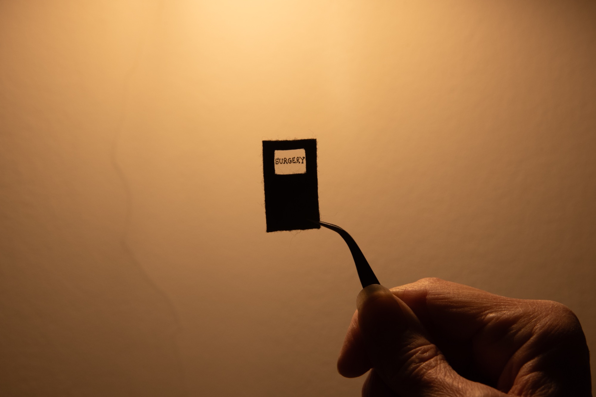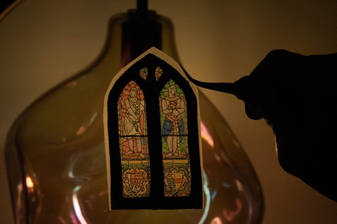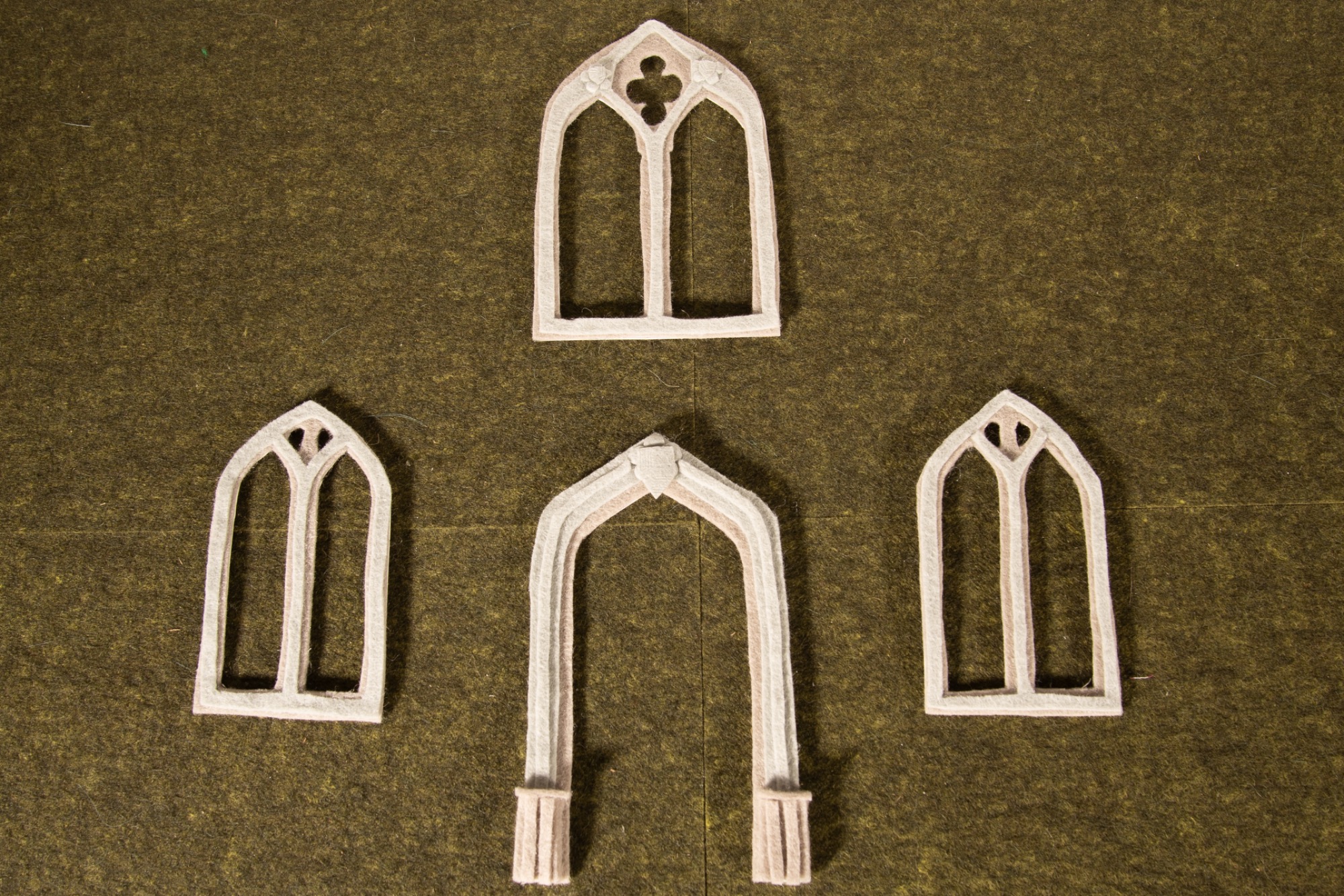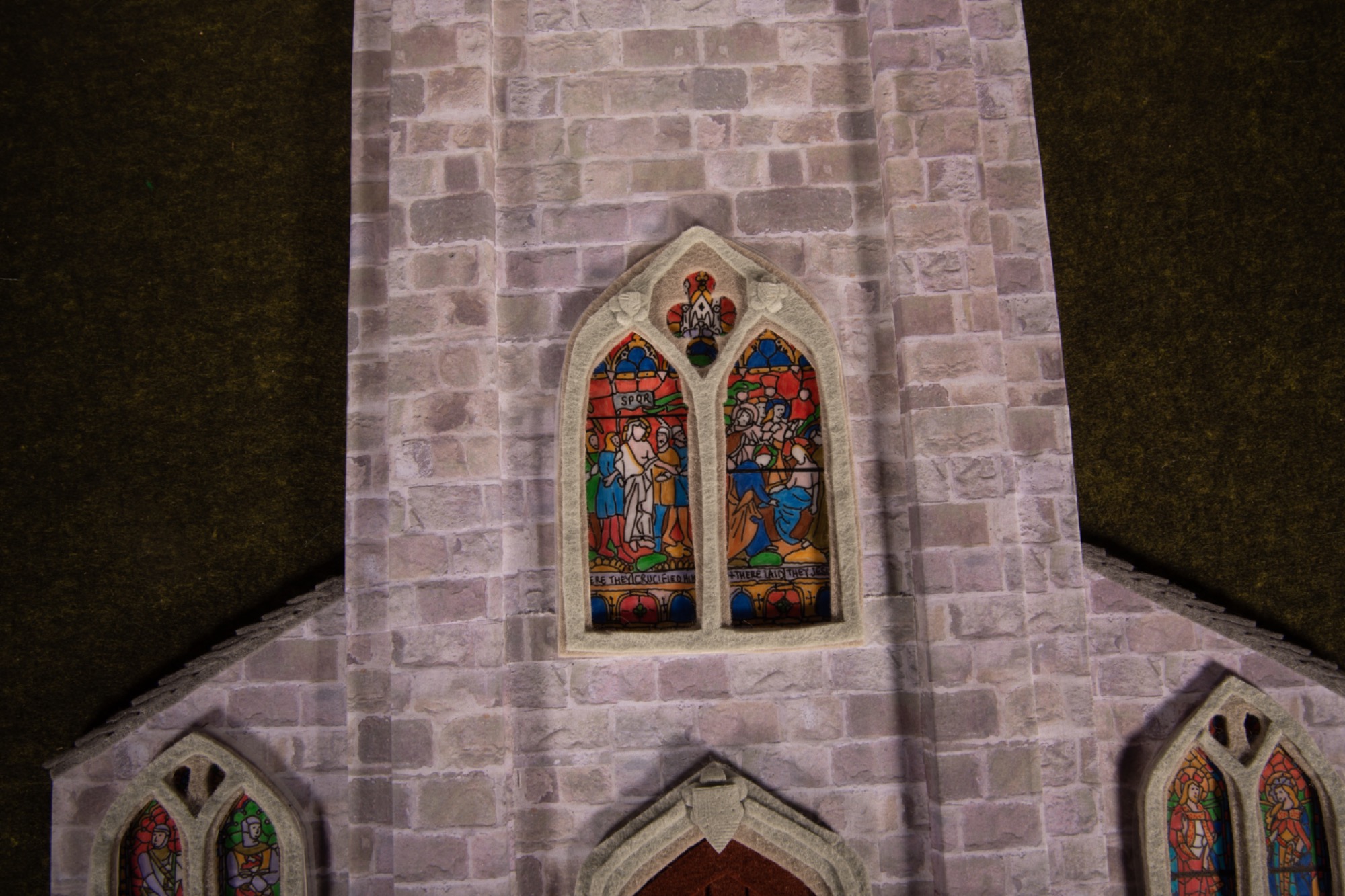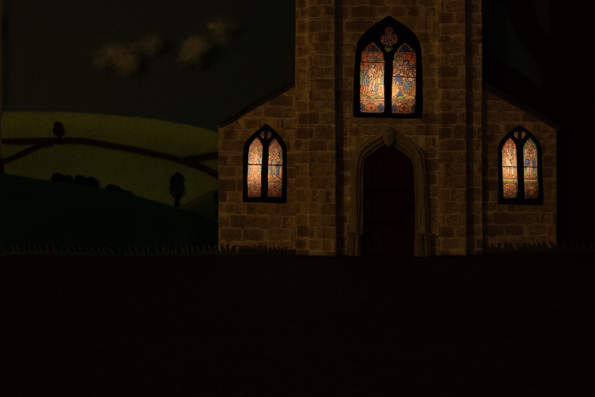 St Cuthbert's Church came to life for the Christmas carol singers. The pictures show the church tower as the starting point, with the side transepts then being added. The window and door frames were then created out of felt. The stained glass windows were drawn onto tracing paper and coloured using felt pens. The door and the windows were placed onto the church. Having confirmed everything fitted well, the stained glass needed to be back lit as the carols were going to be sung in the evening outside the church. Various light sources were tested, with candle light chosen as it offered a warm soft light. The church and back ground of the Feltbury Green hills was photographed to create the night time backdrop. The lit stained glass windows were added to provide the finishing touch. Each of the carol singers and the Reverend Jonathan were individually photographed in candlelight and then carefully positioned to create the final Christmas carol scene