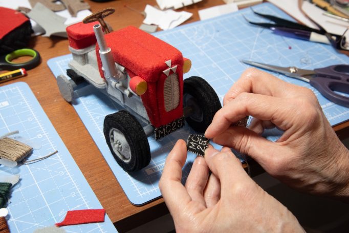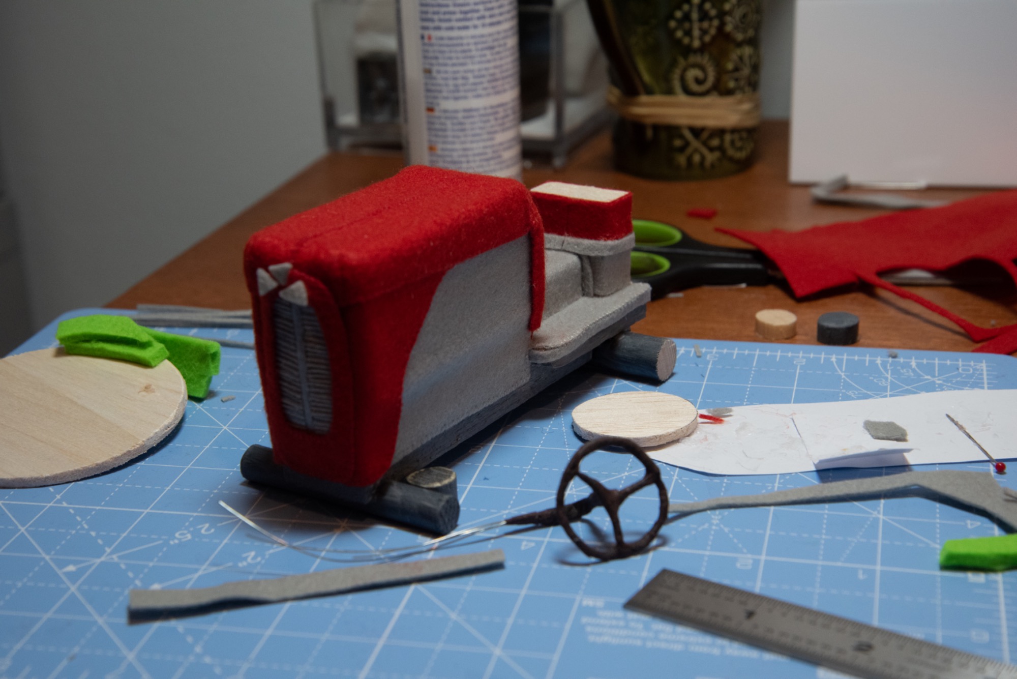 Ruby started with a chassis, wheel rims and an engine block made from balsa wood. The rest of her is made entirely from felt. The pictures below show the various stages she went through, before finally being driven out of the craft room by Adam taking her for a test drive. Expect to see Ruby appear regularly down at Feltbury Farm