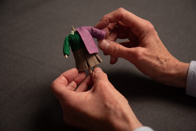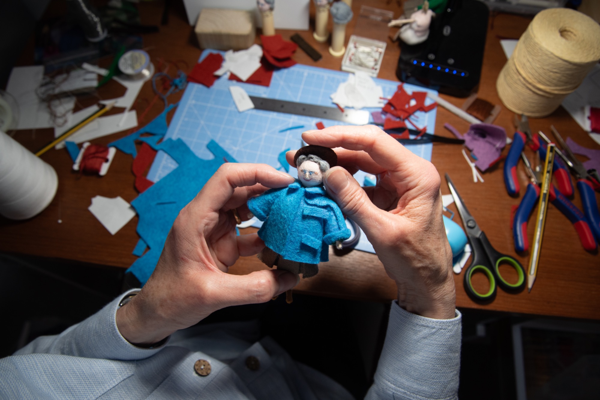The creative journey of Stephen Arbroath, from the making of the head through to the finished character. Each stage of creation takes time and an eye for the detail. The heads are made first, then the hat is fashioned. The bodies come next, followed by the clothes including shirt, tie, trousers and then the coat or cardigan. Finally all the elements come together and that is when the magic happens, the character comes to life!